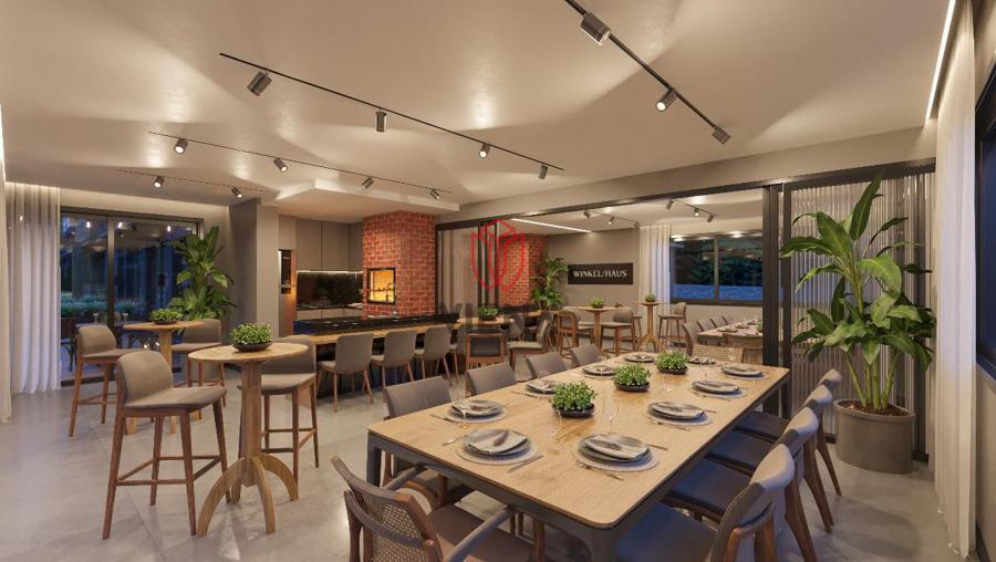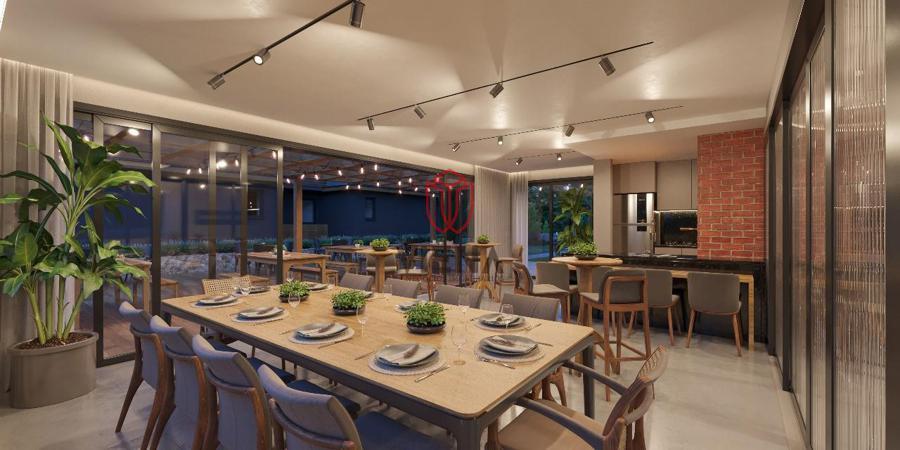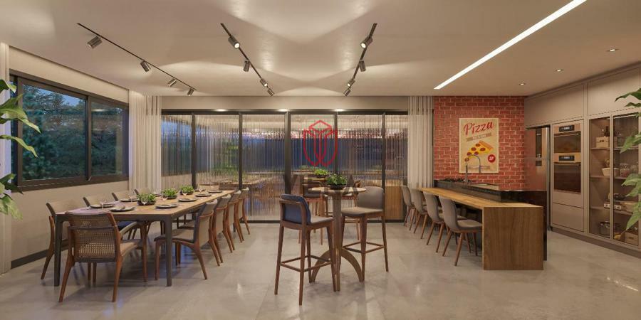 São dois salões de festas, um com fornos de pizza e outro com parrilla e deck gourmet, que podem ser unificados e transformados em um grande salão.
