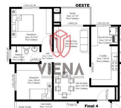 Apartamento com 67,68m², são 2 dormitórios, sala com dois ambientes, cozinha, lavanderia, banheiro e sacada com churrasqueira. Posição Norte/Oeste;
