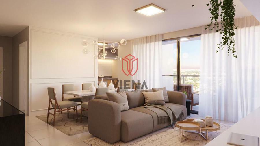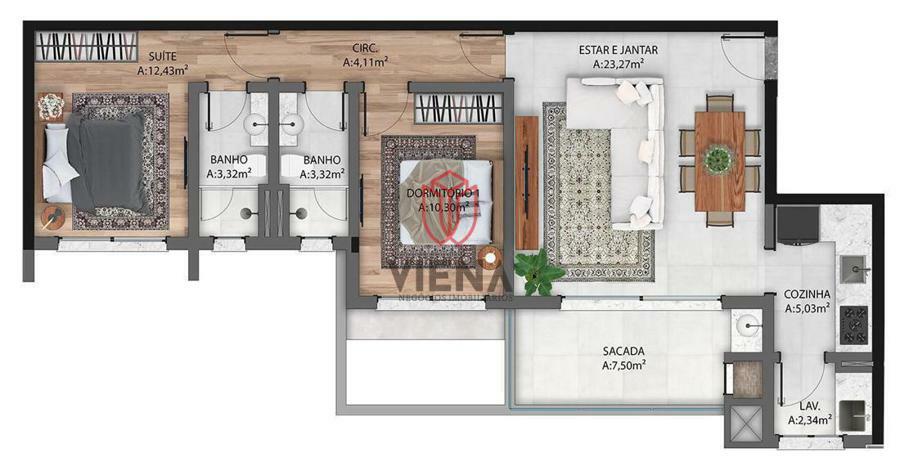 Amplo apartamento de 2 dormitórios, sendo 1 suíte, com salas integradas, sacada com churrasqueira, banheiro social.
