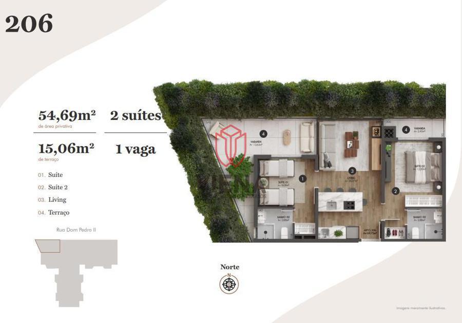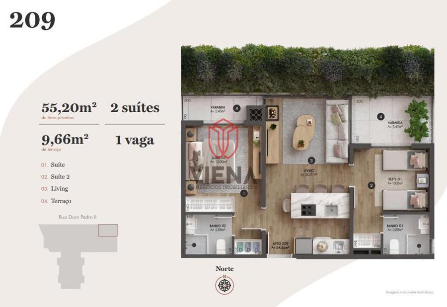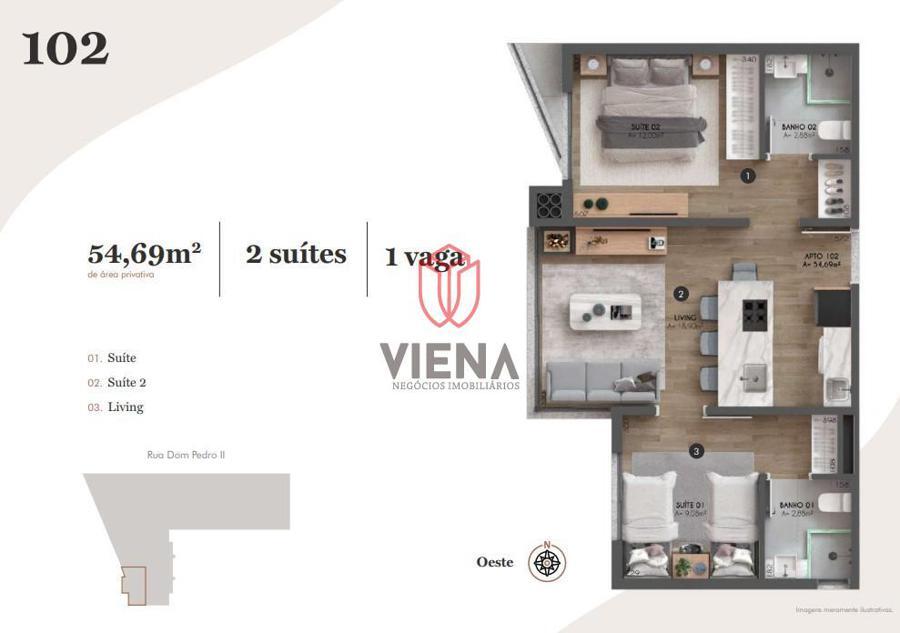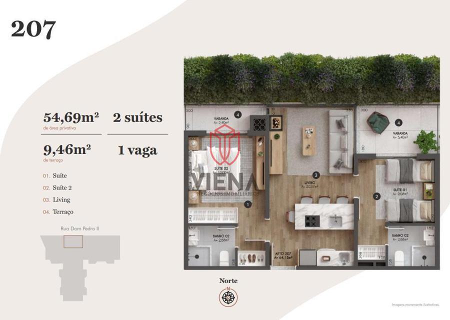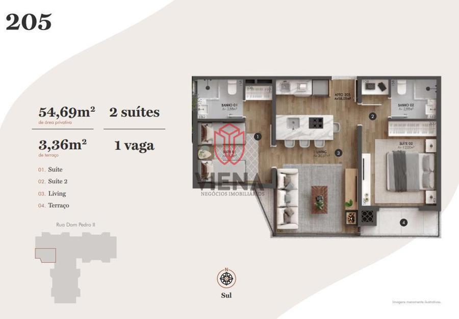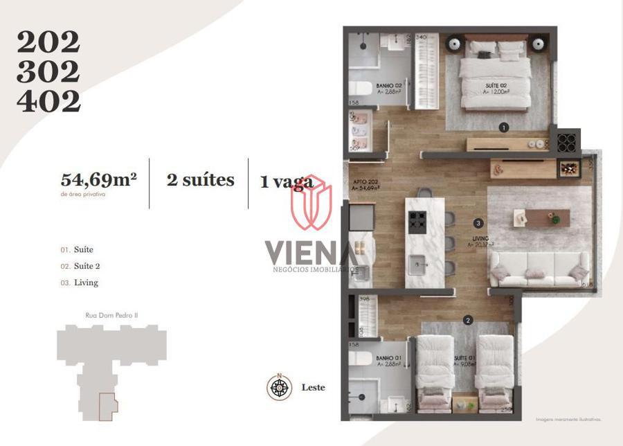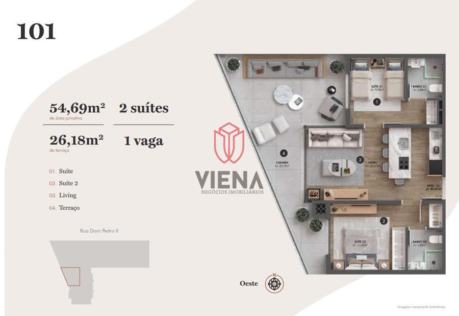São 41 apartamentos com 2 suítes cada, área privativa do apartamento de 54,69m².
