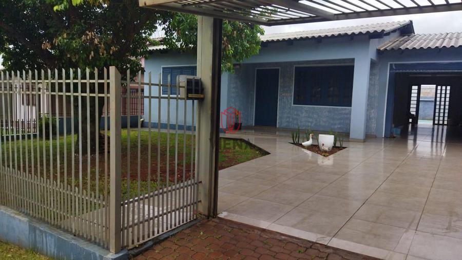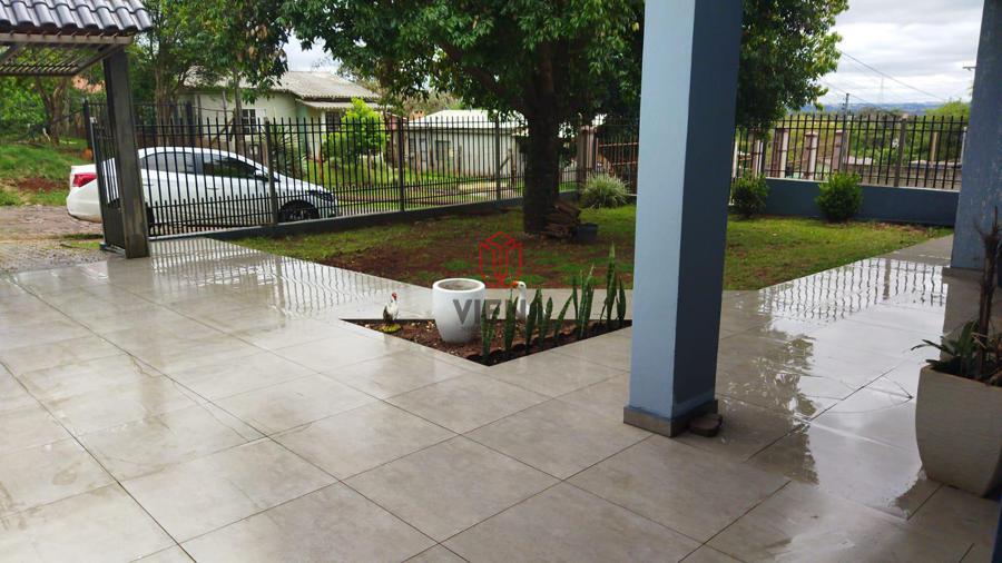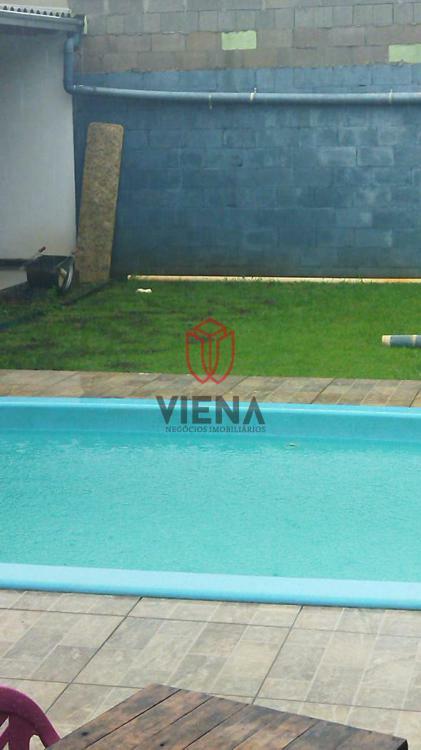 Linda casa de alvenaria com pátio amplo e piscina, todo fechado de muros e grades.